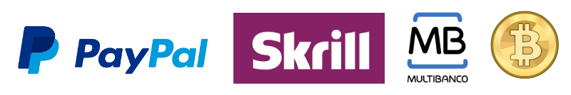 Aceite vários métodos de pagamentos com Paypal, Skrill, Multibanco e Bitcoin. Tem algum outro meio de pagamento, consulte-nos.